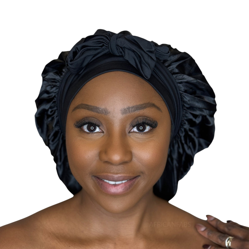 Satinhaube / Satin Hair Bonnet mit Bändern - Schwarz ( Satin Schlafhaube )
