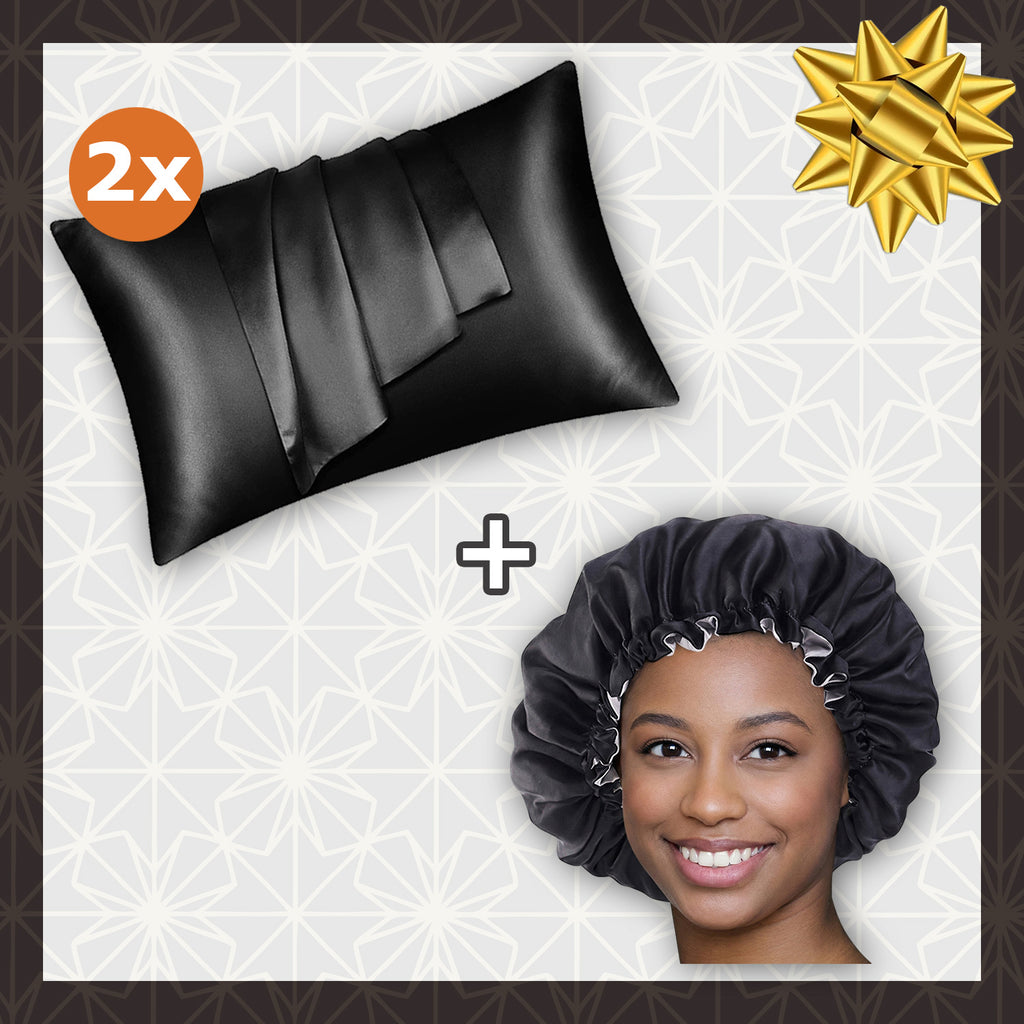 SATIN-SET - Schütze dein Haar und deine Haut - Schwarze Satin bonnet / Schlafhaube + 2 x Satin-Kissenbezug