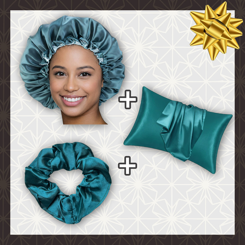 SATIN-SET - Schütze dein Haar und deine Haut - Teal Satin bonnet / Schlafhaube + Satin-Kissenbezug + Scrunchie